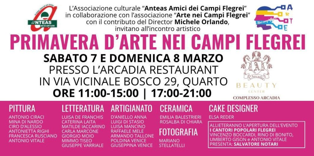 L’associazione Anteas del Presidente Alfonso Coppola, in collaborazione con l’associazione Arte nei Campi Flegrei, della Presidente Francesca Rusciano,ha realizzato nella splendida cornice dell’Arcadia, del Direttore Michele Orlando una due giorni dedicata all’arte in tutte le sue declinazioni.