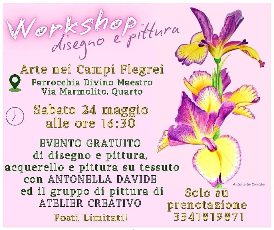 Il giorno 24 maggio alle 16:30, si terrà presso la sede dell’Associazione Arte nei Campi Flegrei, un workshop gratuito di disegno e pittura, acquerello e pittura di tessuto con l’artista Antonella Davide e il gruppo di Atelier Creativo. Tale iniziativa è il frutto della programmazione di molteplici attività artistiche e culturali organizzate dalla Presidente Francesca Rusciano e dalle artiste dell’associazione. Nel merito della manifestazione, essa rappresenterà l’opportunità di inclusione, condivisione e passione, attraverso il linguaggio universale dell’arte. La finalità ha una duplice valenza, artistica con la presenza dell’artista Antonella Davide, eccellenza nel dipinto a mano con realizzazioni di opere meravigliose, e dall’altro la libertà di espressione dell’animo, come forma di benessere psicofisico.