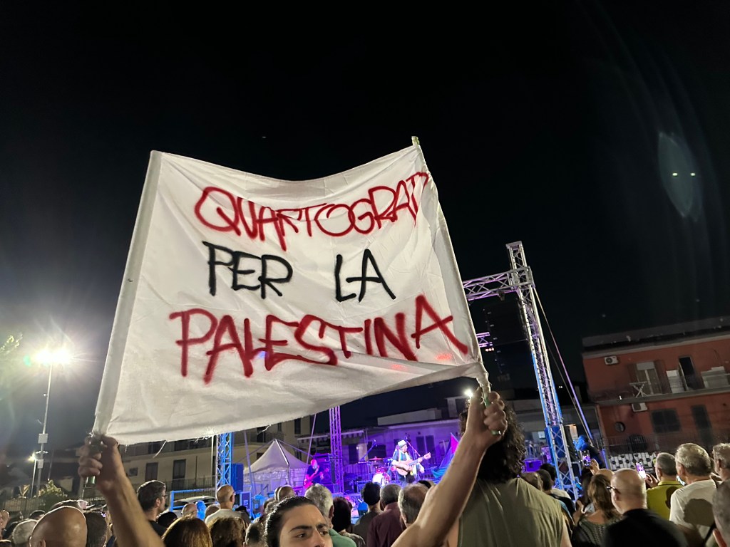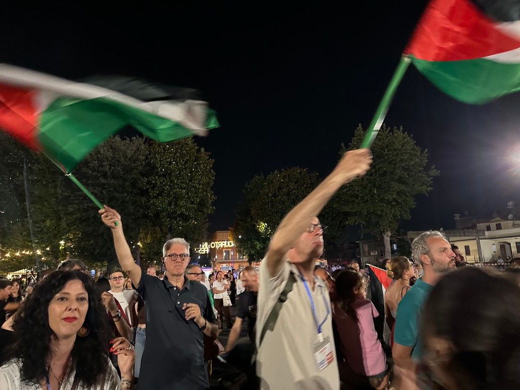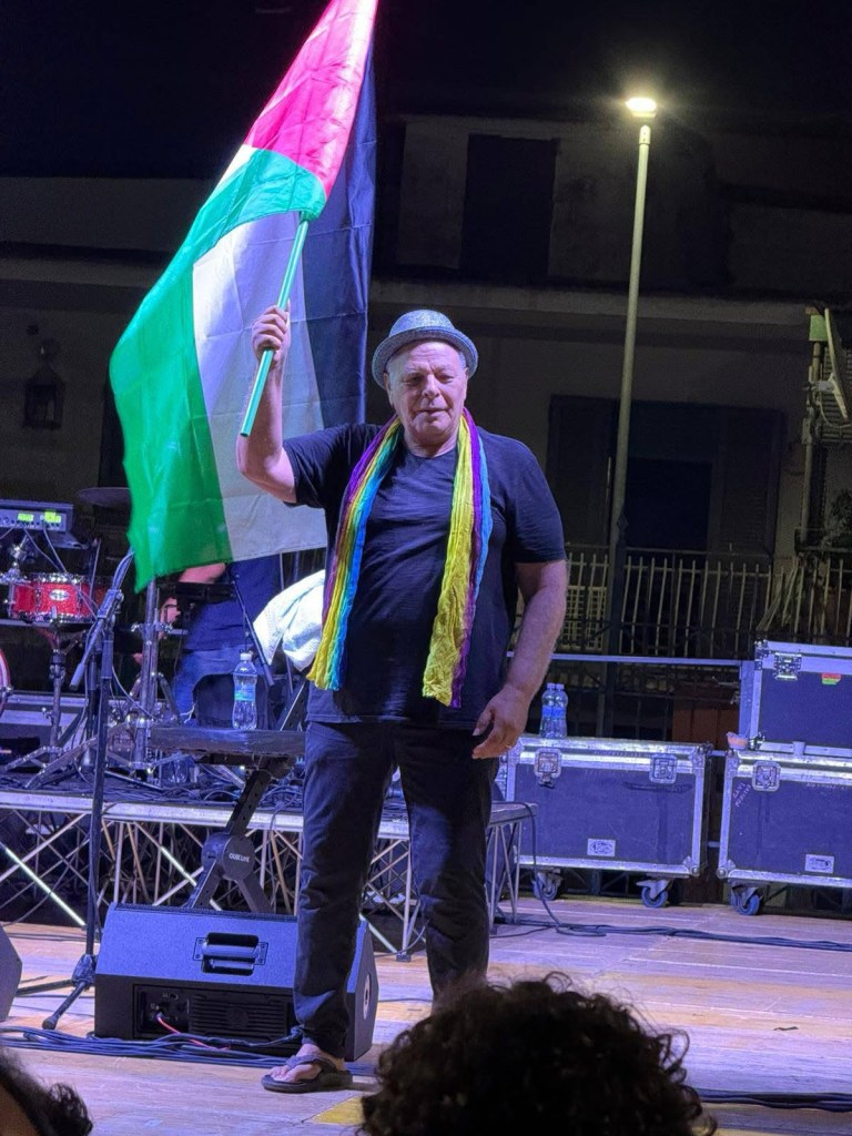 Non si è fatta attendere la posizione pro Gaza e di condanna alle guerre di Gragnaniello, “l’amore è complicato e la guerra ‘a fanne e strunz”, sventolando la bandiera Palestinese in un tripudio di applausi.
