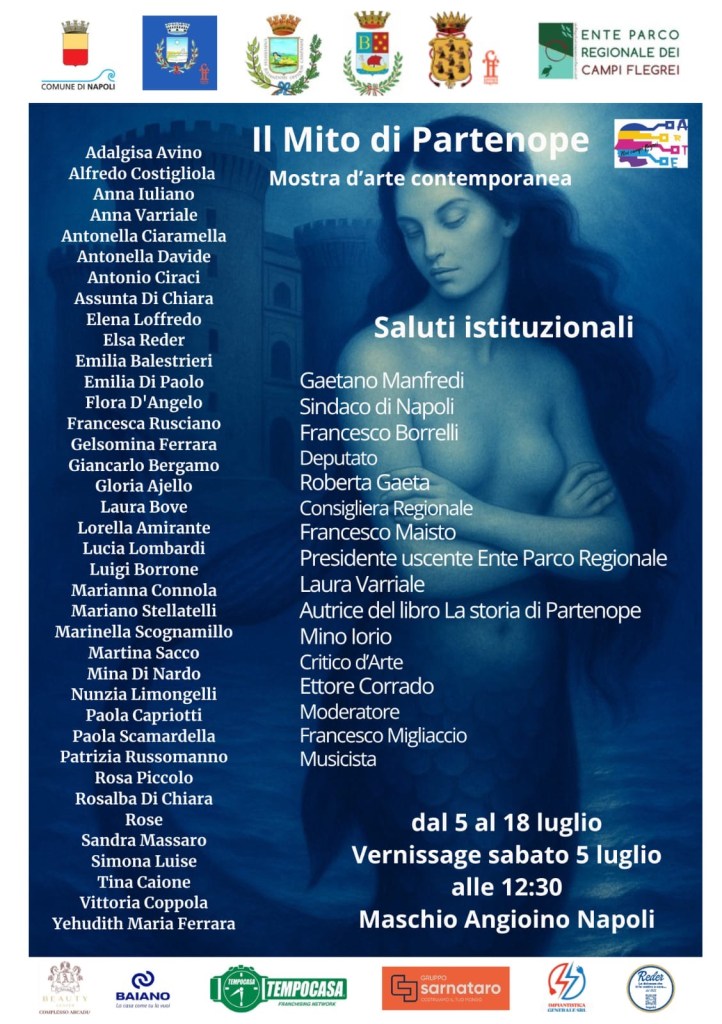 Dal 05 al 18 luglio 2025 nell’anniversario dei duemilacinquecento anni di Partenope, presso la Sala degli Angeli del Maschio Angioino, si terrà la tappa conclusiva della mostra itinerante “il Mito di Partenope”. Un anno di arte e cultura curata dalla Presidente dell’Associazione Arte nei Campi Flegrei, Francesca Rusciano.